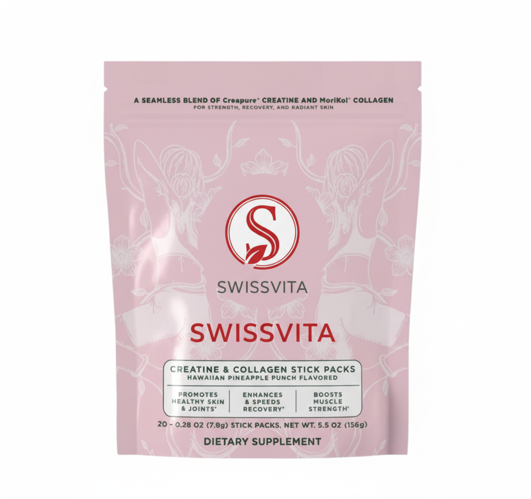 SwissVita Creatine & Collagen Stick Pads combines Creapure® creatine and MoriKol® marine collagen in a refreshing pineapple punch formula — crafted to help you reveal a radiant glow from within. Clean, convenient, feel as strong as you look.